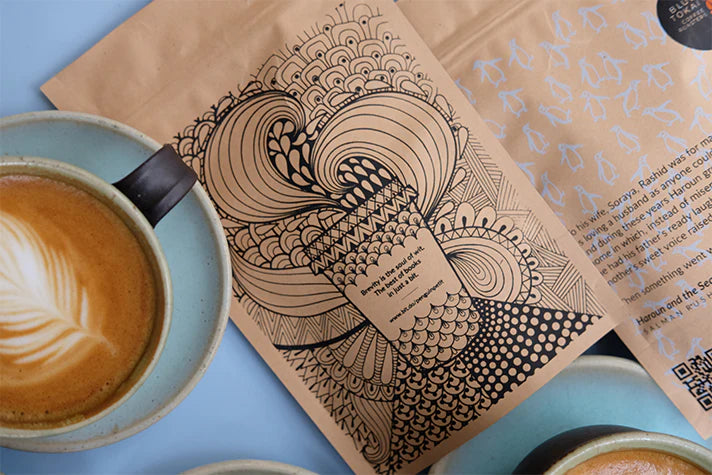 We make gifting coffee easy and memorable for you! Our gifting collection includes beautifully decorated gift boxes and couple up coffee with an assortment of brewing equipment, as well as our ceramic cups. From roasted coffee pouches to coffee that can be brewed hassle-free without any brewing equipment, our gifts have been designed keeping every coffee need in mind! We offer our partners a number of customised, personalised coffee pouches that can be screen printed and customised for different events or get customised gift boxes that match your company’s colour theme. A pouch made for Penguin Random House which also contained a QR code to popular Indian stories.